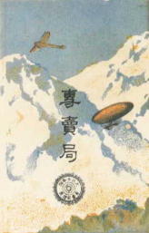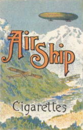 この「エアーシップ」も同じ年のリプリント版から。『日本のたばこデザイン』によると、このパッケージは1921(大正10)年〜1937(昭和12)年まで発売されていた紙箱10本入り用のもので、50本入り丸缶のものではありません。構図はほぼ同じですが、稜線や飛行船・飛行機の位置などが丸缶とは若干異なっており、描き直されています(丸缶については「YOSHIのホームページ」参照)。