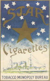 このデザインの「スター」(10本入り)が発売されたのは1904(明治37)年で、『日本のたばこデザイン』によると、「濃い紺地の夜空に輝く星くずのなかに、一段と大きい金色の星がアイ・キャッチャーとなり、その上にアール・ヌーボー調のレタリングでSTARと入れ、画面の下に軍艦が描いてある。翌年輸出用と国内用と図案を変え、国内用は軍艦と裏面の樹木のある夜景を除き、空はむら雲が側面から裏面へ回り、正面の金色の星が白抜き、裏面は草むらとなった。STARの書体も変わり、半円形に書き直されたCIGARETTESの配置もよく……」とあります。