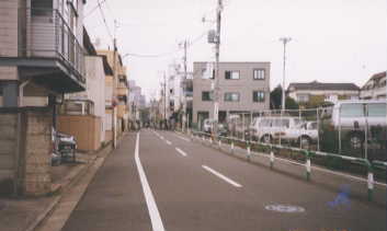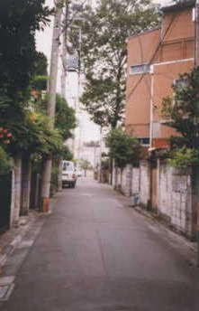 真っ直ぐ数分歩くと、例の二手に分かれる場所にさしかかります。ここから始まる一角(旧「丹羽邸」の敷地)は、現在では住宅、アパート、事務所などが数十軒びっしりと立ち並んでいて、タルホが述べているような当時の面影はまったくありません。道なりに右手に進むと、昔とまったく同じ形のいびつな曲がり角があります。道路はすぐその先の角から右方向へ進んでいきますが、その角から正面に真っ直ぐ延びた狭い路地があります。