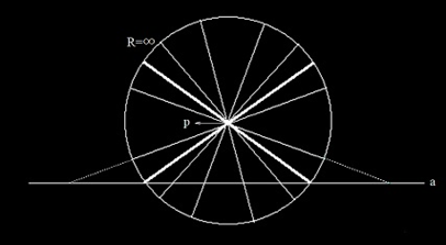 しかしながら、この図で理解しにくいのは、直線aが、R=∞の円の外≠ワで延長して描かれていることです。そうすると、半径無限大の円より長い直線≠ェ想定されているわけで、矛盾が生じます。タルホもここで、半径無限大の円の外≠「あの世」と形容していますが、そうすると無限大に内≠ニ外≠想定することになり、これも論理矛盾になります。